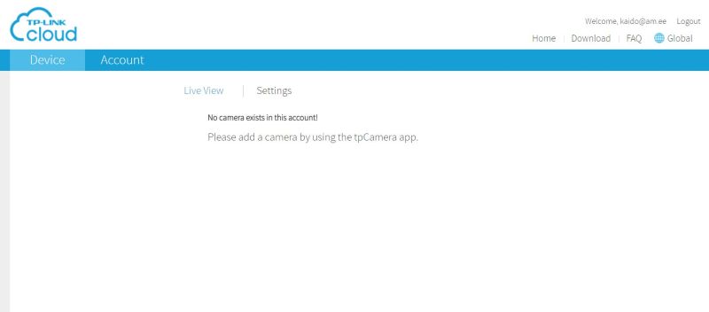 Veebis saab ka TPlinkcloudi pilvekeskkonda oma kaamerakontoga sisse logida, aga testis ei olnud seal mingit Tapo kaamerat näha: